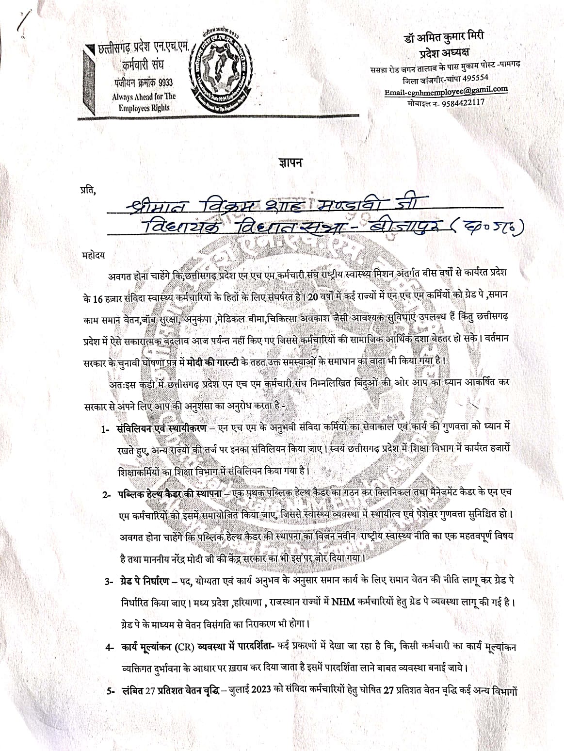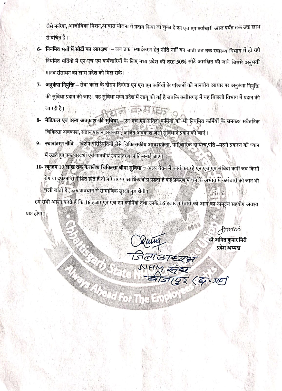 विधायक विक्रम मंडावी को एनएचएम कर्मचारी संघ द्वारा सौंपे गए ज्ञापन में संविलियन एवं स्थायीकरण, पब्लिक हेल्थ कैडर की स्थापना कर एक पृथक पब्लिक हेल्थ कैडर का गठन कर क्लिनिकल तथा मैनेजमेंट कैडर के एन एच एम कर्मचारियों को इसमें समायोजित करने, ग्रेड पे निर्धारण करने, कार्य मूल्यांकन (सीआर) व्यवस्था में पारदर्शिता लाने, लंबित 27 प्रतिशत वेतन वृद्धि देने, नियमित भर्ती में सीटों का आरक्षण देने, अनुकंपा नियुक्ति देने, मेडिकल एवं अन्य अवकाश की सुविधा देने, शासन के स्थानांतरण नीति का लाभ दिए जाने और न्यूनतम 10 लाख तक कैशलेश चिकित्सा बीमा सुविधा देने जैसे प्रमुख मांग छत्तीसगढ़ प्रदेश एनएचएम कर्मचारी संघ ने की है।