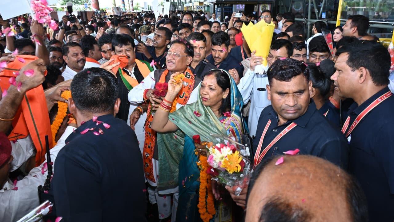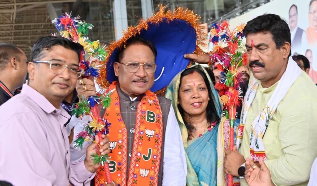 एयरपोर्ट पर हुआ भव्य स्वागत, कर्मा-पंथी नृत्यों से सराबोर रहा एयरपोर्ट परिसर
