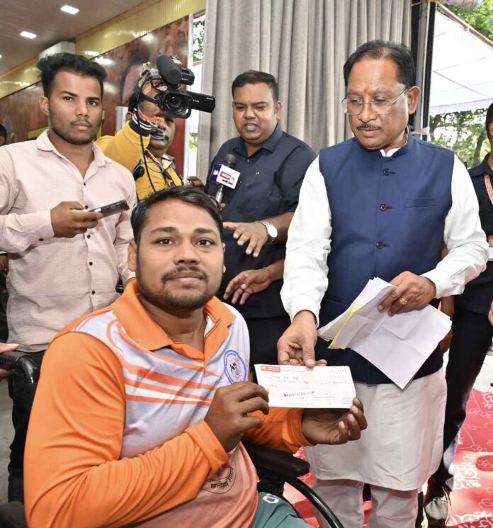 रायपुर, 13 नवंबर 2025/मुख्यमंत्री श्री विष्णु देव साय के निवास में आयोजित जनदर्शन कार्यक्रम में आज रायपुर जिले के अभनपुर से आए दिव्यांग रग्बी खिलाड़ी श्री पिंटू राम साहू की मांग पर मुख्यमंत्री ने त्वरित निर्णय लेते हुए 90 हजार रुपए का आर्थिक अनुदान स्वीकृत किया। श्री साहू ने व्हीलचेयर और आवश्यक खेल सामग्री खरीदने हेतु सहायता मांगी थी। उनकी परिस्थितियों और आवश्यकता को समझते हुए मुख्यमंत्री ने उन्हें तत्काल चेक प्रदान कर उनकी सहायता की।