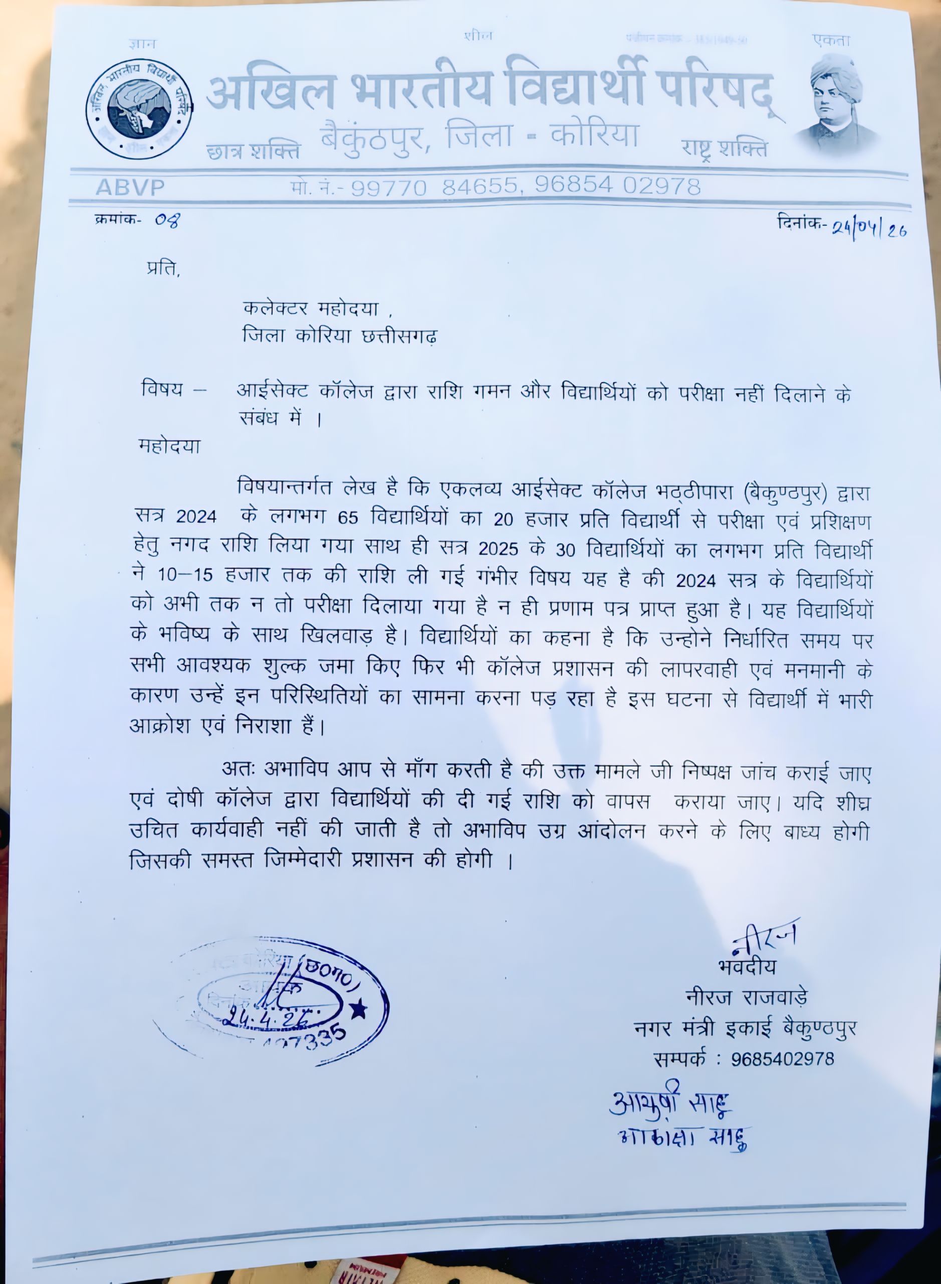 बैकुंठपुर।।अभाविप इकाई, बैकुंठपुर द्वारा दि एकलव्य आईसेक्ट प्रशिक्षण संस्थान, भट्टी पारा, बैकुंठपुर द्वारा विद्यार्थियों के साथ की जा रही, कथित अनियमितताओं एवं आर्थिक शोषण के विरोध में कलेक्टर महोदया को ज्ञापन सौंपकर* त्वरित कार्रवाई की मांग की गईं।