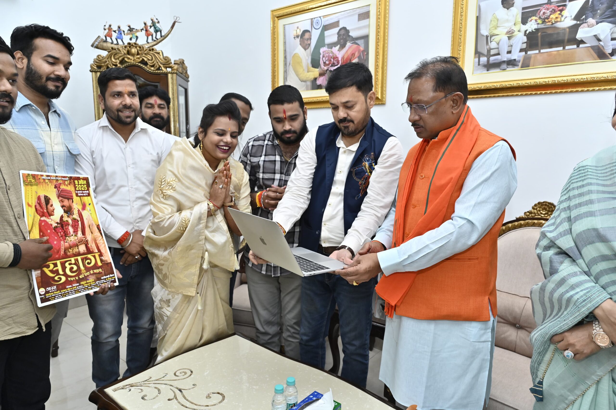 रायपुर । मुख्यमंत्री श्री विष्णु देव साय ने आज अपने निवास कार्यालय में रामनवमी के शुभ अवसर पर पारिवारिक छत्तीसगढ़ी फिल्म सुहाग का ट्रेलर लॉन्च किया।उन्होंने विधायक और फिल्म में मुख्य किरदार निभा रहे अभिनेता पद्मश्री अनुज शर्मा और उनकी पूरी टीम को बधाई व शुभकामनाएं दी। इस अवसर पर विधायक श्री पुरन्दर मिश्रा, नवनियुक्त छत्तीसगढ़ राज्य केश शिल्पी कल्याण बोर्ड की अध्यक्ष सुश्री मोना सेन, राज्य समाज कल्याण बोर्ड की अध्यक्ष श्रीमती शालिनी राजपूत, उपाध्यक्ष श्रीमती चंद्रकांति वर्मा और छत्तीसगढ़ राज्य तेलघानी विकास बोर्ड के अध्यक्ष श्री जितेन्द्र कुमार भी उपस्थित रहे।