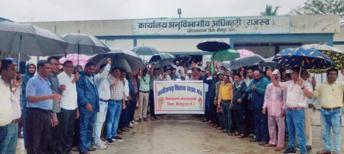 मुर्गेश शेट्टी,भोपालपटनम 01 जुलाई। लगातार हो रही मूसलाधार बारिश भी शिक्षकों के हौसले को डिगा नहीं सकी। छाते और रेनकोट में सैकड़ों शिक्षकों ने मंगलवार को अपनी मांगों को लेकर भोपालपटनम विकासखंड मुख्यालय में जोरदार प्रदर्शन किया। शिक्षकों ने शासन के प्रति नाराजगी जाहिर करते हुए एसडीएम को मुख्यमंत्री के नाम ज्ञापन सौंपा।
