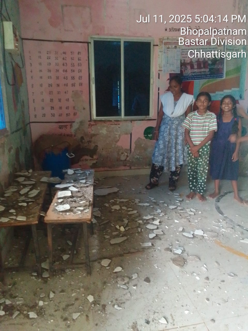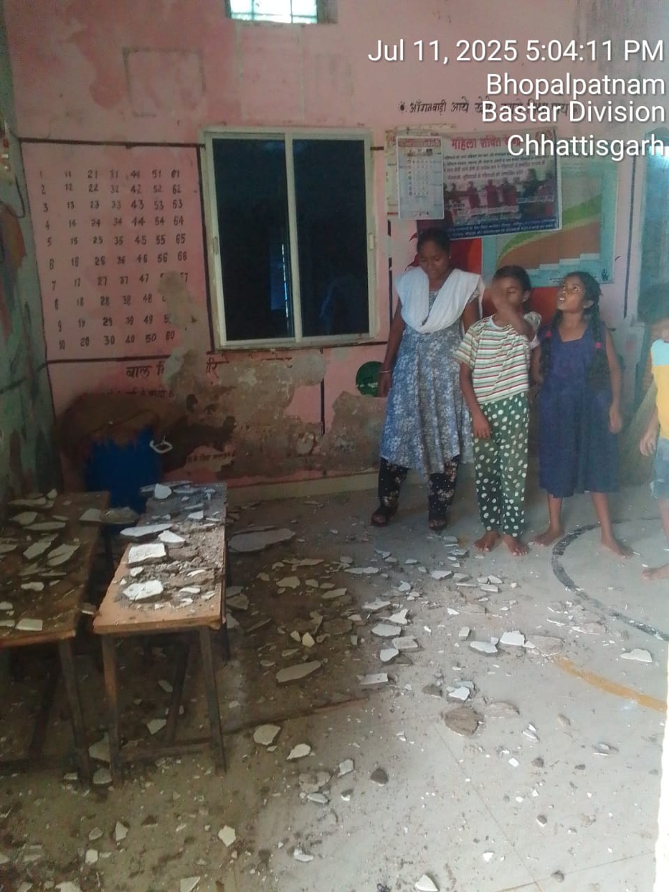 मुर्गेश शेट्टी,बीजापुर।जिले के भोपालपटनम ब्लॉक अंतर्गत ग्राम पंचायत रूद्रारम के कोनागुड़ा आंगनबाड़ी केंद्र में एक बड़ा हादसा टल गया। प्राप्त जानकारी के अनुसार, 11/7/25 कल शाम करीब 5:00 बजे के आसपास केंद्र की छत का सीलिंग अचानक गिर पड़ा।
