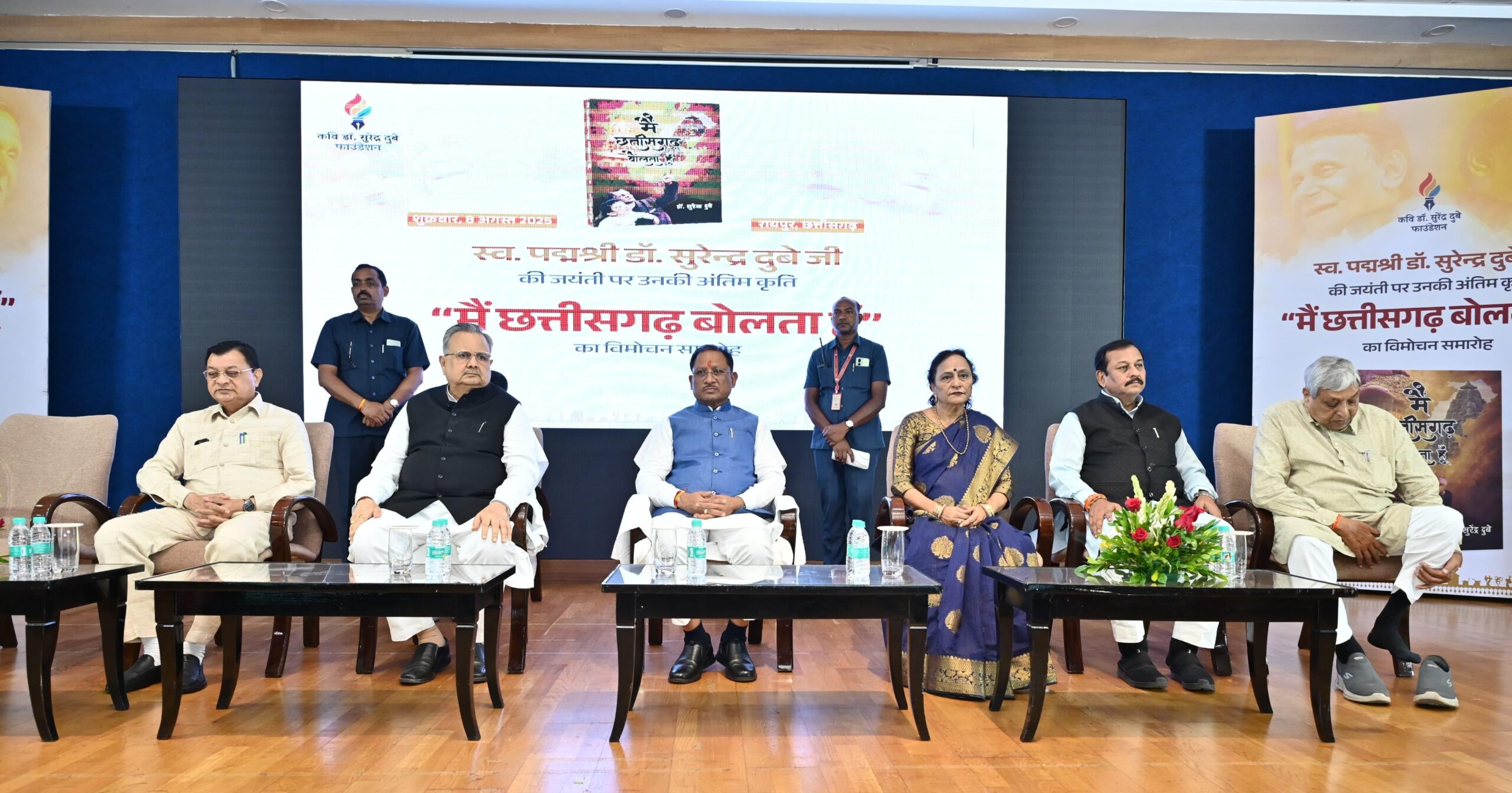 रायपुर, 08 अगस्त 2025/ मुख्यमंत्री श्री विष्णु देव साय आज शाम स्वर्गीय पद्मश्री डॉ. सुरेन्द्र दुबे की जयंती के अवसर पर उनकी अंतिम काव्य कृति “मैं छत्तीसगढ़ बोलता हूँ” के विमोचन कार्यक्रम में सम्मिलित हुए। यह आयोजन राजधानी स्थित मैक कॉलेज ऑडिटोरियम में सम्पन्न हुआ। कार्यक्रम की अध्यक्षता विधानसभा अध्यक्ष डॉ. रमन सिंह ने की।